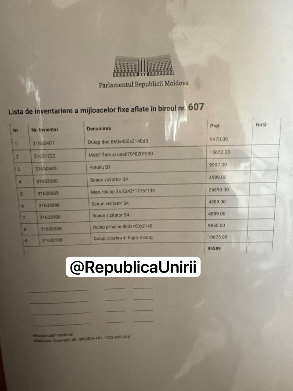 Deputatul partidului „Democrația Acasă”, Alexandru Verșinin, se arată indignat de prețul la fotoliul din cabinetul său din clădirea Parlamentului, afișat într-o listă în care se enumeră mobilierul pus la dispoziția alesului. „Eu cunosc prețurile la scaune, dulapuri, mese. Vreau să văd un preț corect”, a declarat parlamentarul, în cadrul emisiunii „7 zile” de la Cinema 1.