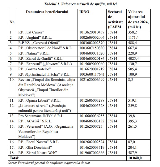 Informația a fost extrasă din recenta Decizie a Consiliului Concurenței care a autorizat schema de ajutor de stat pentru anul 2024, banii fiind achitați de Ministerul Culturii către Întreprinderea de Stat ”Poșta Moldovei”, în urma majorării de către aceasta a tarifelor de distribuire a publicațiilor periodice.