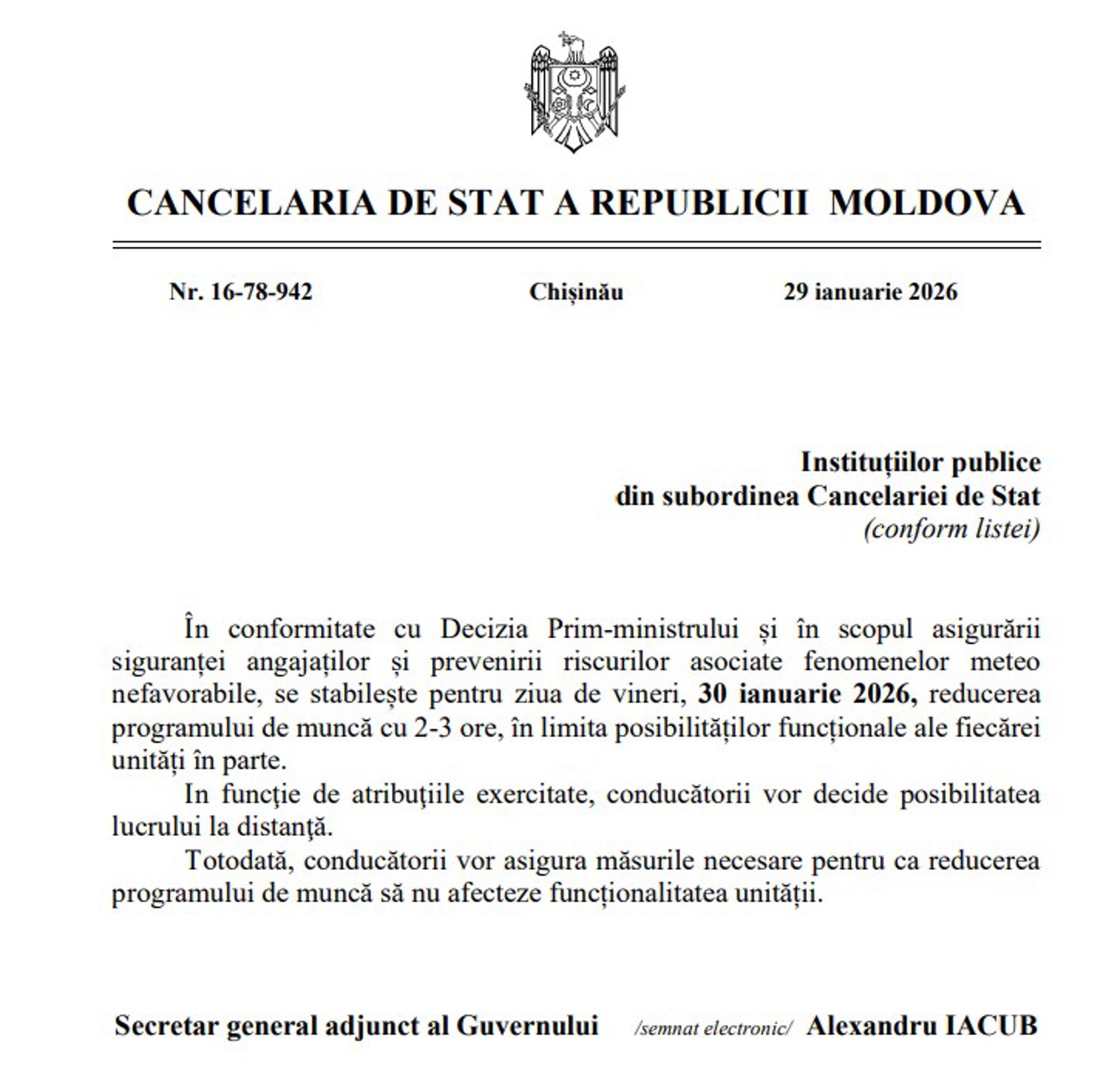 „În funcție de atribuțiile exercitate, conducătorii vor decide posibilitatea lucrului la distanță. Totodată, conducătorii vor asigura măsurile necesare pentru ca reducerea programului de muncă să nu afecteze funcționalitatea unității”, se arată într-o notă trimisă de secretarul general adjunct al Guvernului, Alexandru Iacub, instituțiilor aflate în subordinea Cancelariei de Stat.